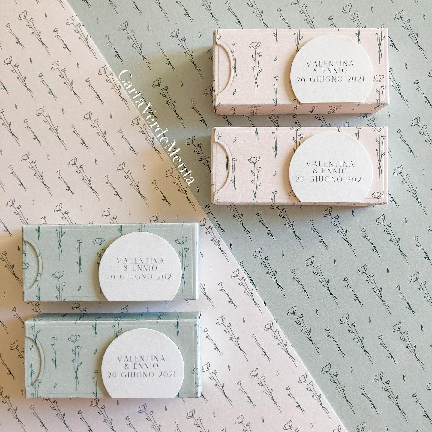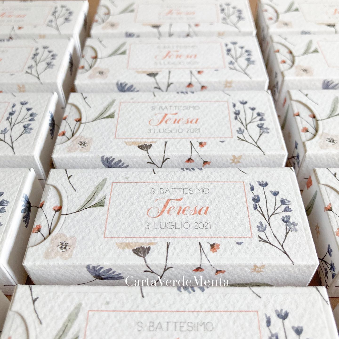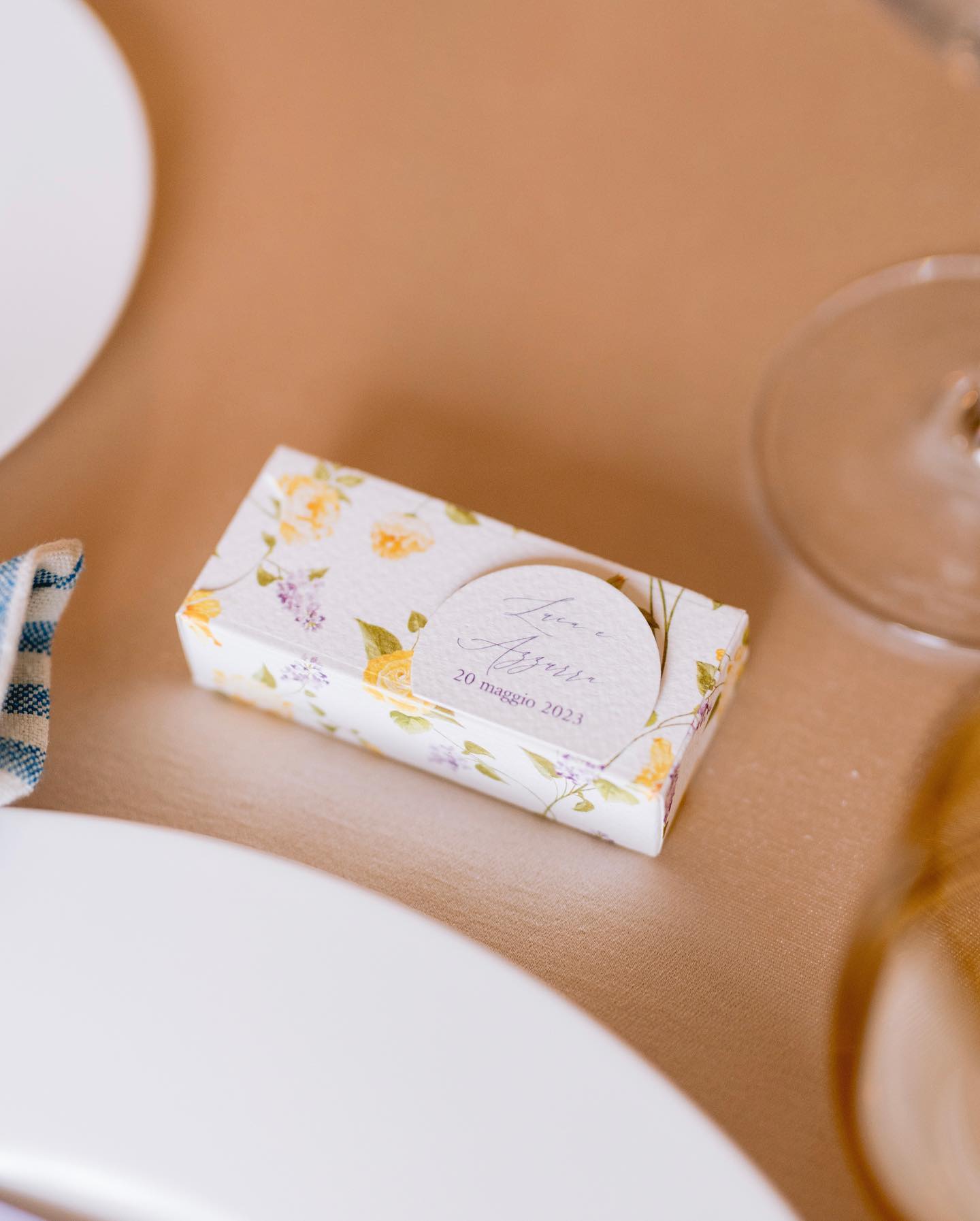 Scatolina fustellata e decorata a mano, dalle linee semplici e personalizzabile ogni suo elemento.