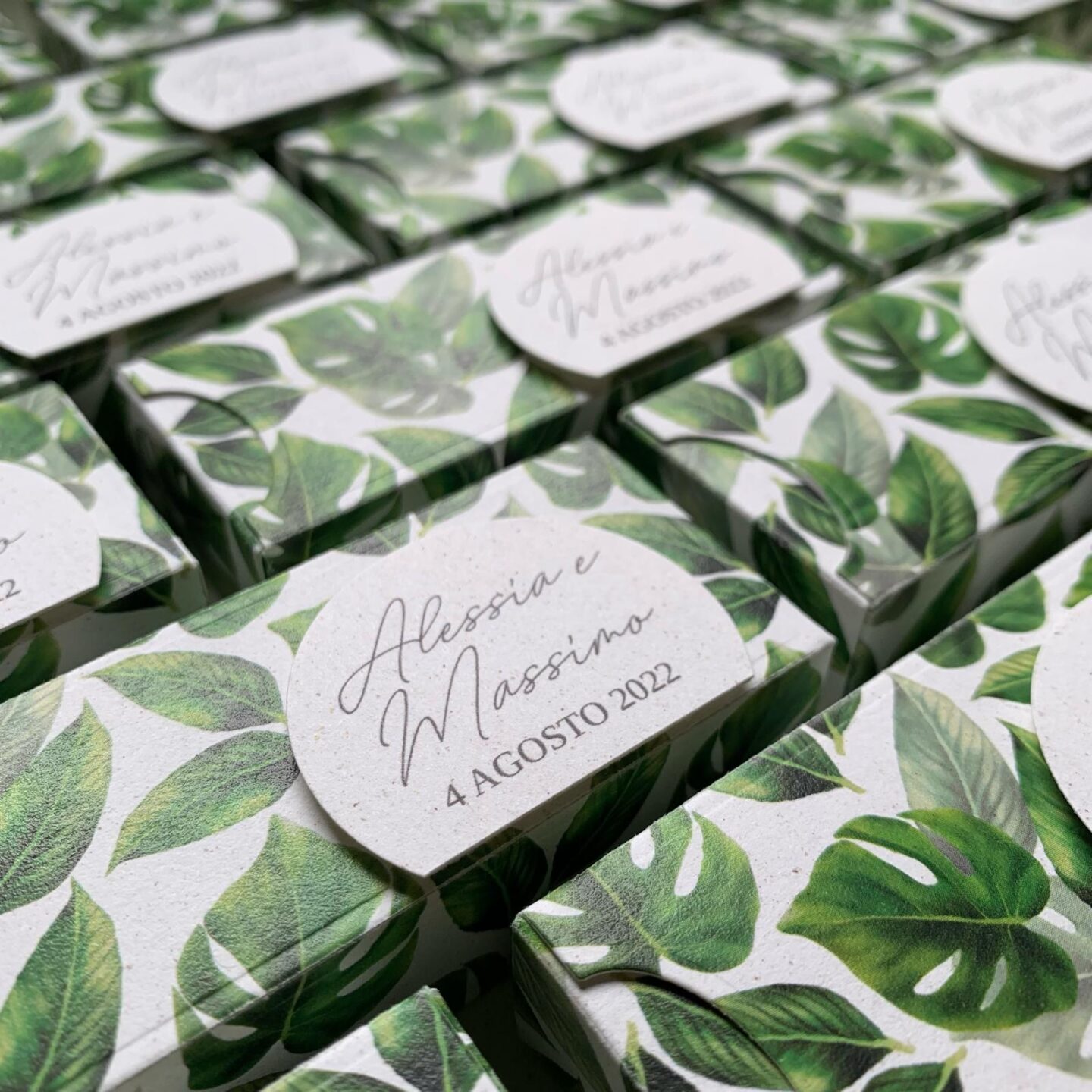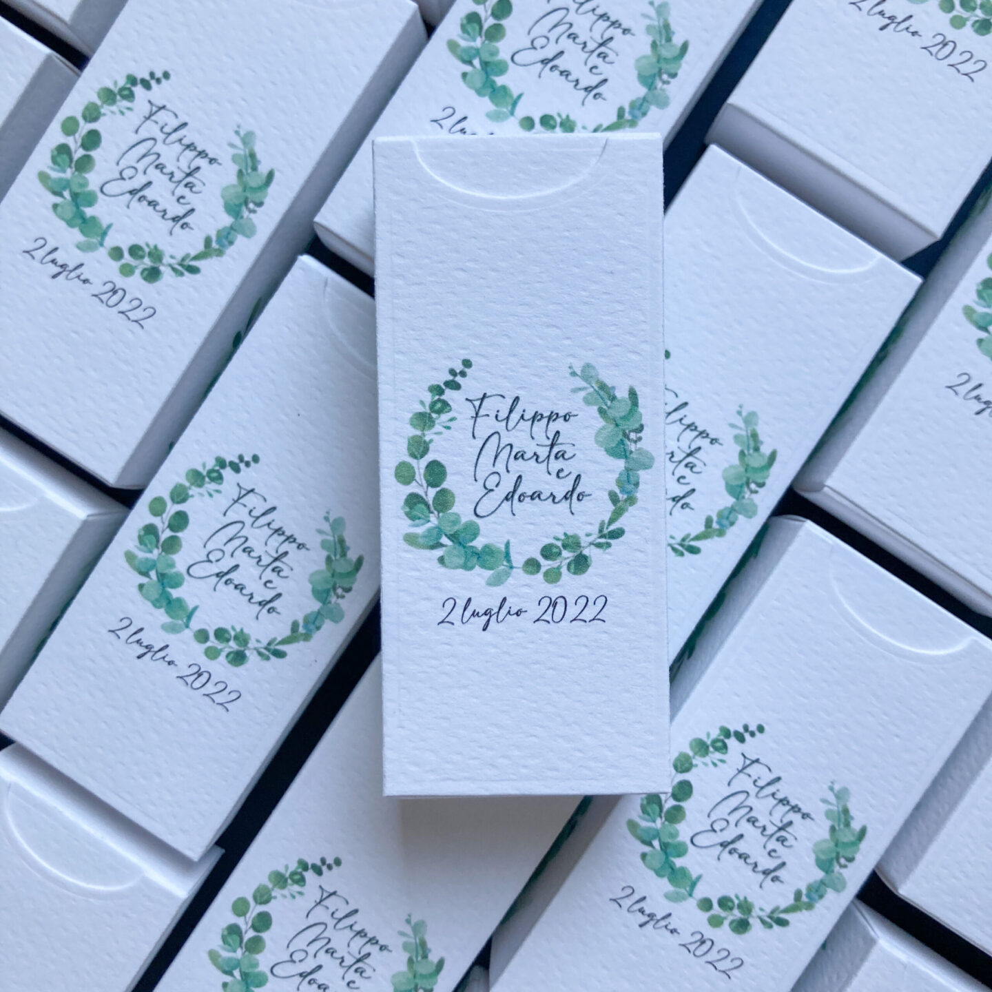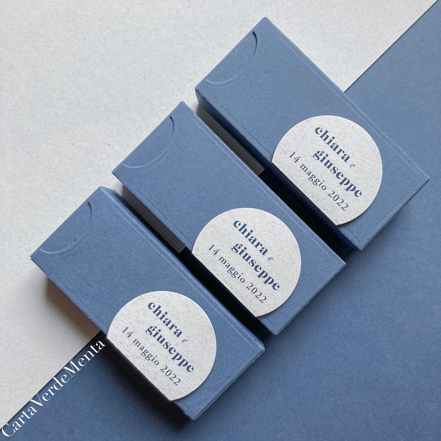 Scatolina fustellata e decorata a mano, dalle linee semplici e personalizzabile ogni suo elemento.